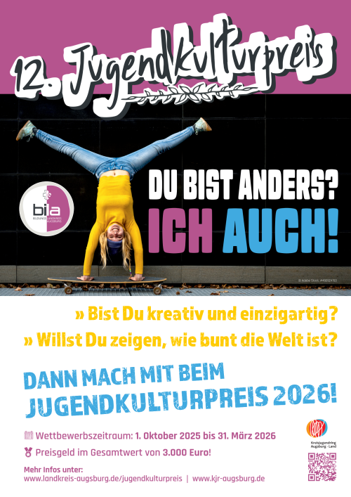 Alle 2 Jahre fördert und würdigt der Landkreis Augsburg künstlerisches Schaffen von Kindern und Jugendlichen im Alter von zwölf bis 26 Jahren mit insgesamt 3.000 € Preisgeld. Ihr habt außerdem die Chance, Eure Kunstwerke einer großen Öffentlichkeit zugänglich zu machen.